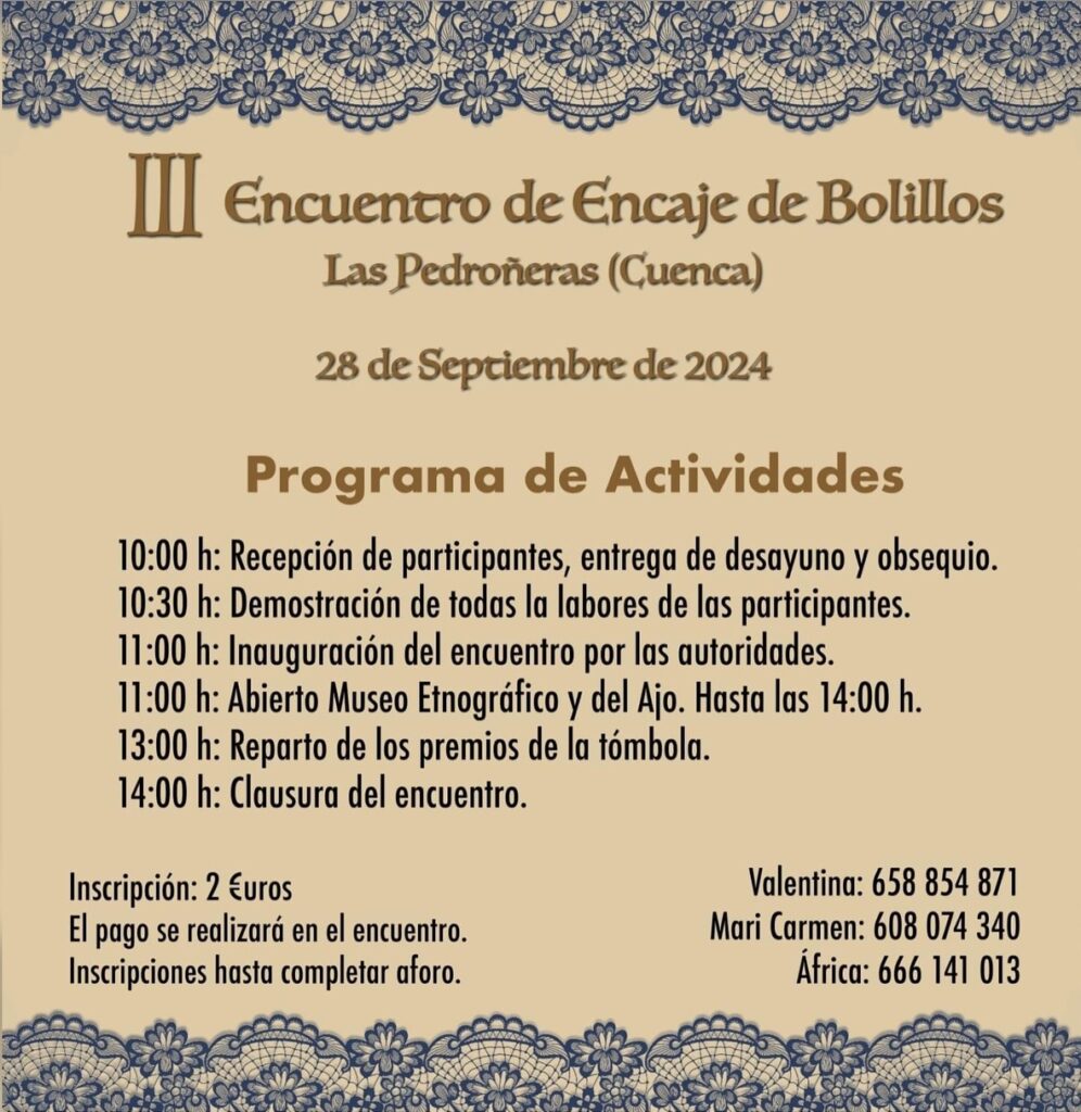 El encuentro, organizado por la Asociación de Bolilleras «El Coso», se ha convertido en un referente para los amantes del encaje de bolillos, siendo un espacio de intercambio cultural y de fomento de esta tradición centenaria. Los asistentes podrán disfrutar de las demostraciones y trabajos en directo de las participantes, que exhibirán su destreza en el manejo de los bolillos.