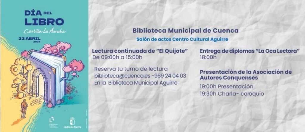 El Ayuntamiento de Cuenca vuelve a celebrar este miércoles 23 de abril, a través de la Red Municipal de Bibliotecas, el Día del Libro con la tradicional lectura continuada de ‘El Quijote’.