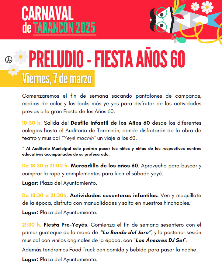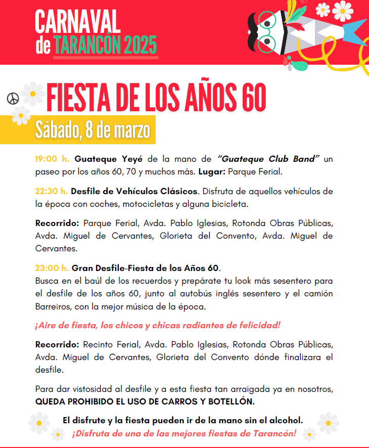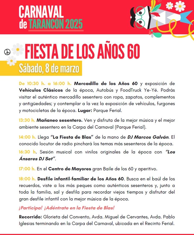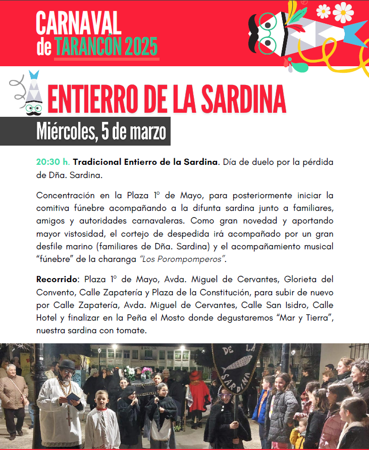 Entre las novedades, destaca que por segundo año se instalará la Carpa del Carnaval en el Parque Ferial, para disfrutar del tardeo carnavalero y del mañaneo y el tardeo sesentero, o las actividades infantiles, mercadillo y guateque programado en la plaza del Ayuntamiento para la víspera de la fiesta de los años 60. Además, el Entierro de la Sardina, que recuperará este 2025 su recorrido habitual tras las obras del año pasado en la calle Zapatería, contará con acompañamiento musical y animación.