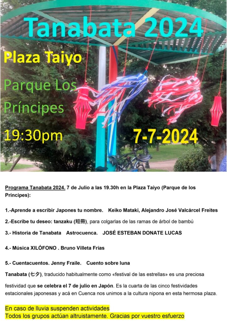 Llega un año más a la Plaza Taiyo, Parque de los Principes, de la capital conquense la Fiesta de Tanabata el próximo domingo 7 de julio. TANABATA (七夕) es una fiesta japonesa llamada “FESTIVAL DE LAS ESTRELLAS” que todos los años la celebran en todo Japón el 7 de julio. Es la cuarta de las cinco fiestas estacionales en Japón. En Cuenca ya durante varios años nos unimos a la Cultura nipona y celebramos el Festival de la Estrellas en la Plaza de Taiyo (Sol).