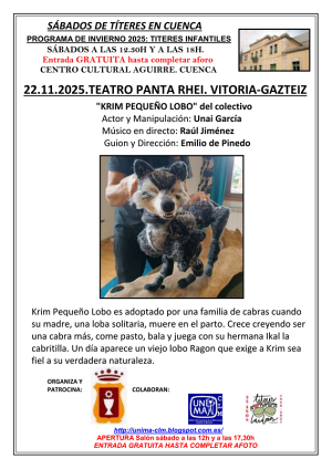 El próximo sábado 22 de noviembre de 2025, el público podrá disfrutar de la obra “Krim Pequeño Lobo”, interpretada por la compañía Teatro Panta Rhei de Vitoria-Gasteiz. La función contará con el actor y manipulador Unai García, música en directo de Raúl Jiménez, y la dirección y guion de Emilio de Pinedo.