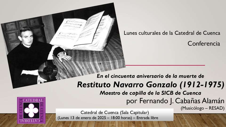 La conferencia estará a cargo de Fernando J. Cabañas Alamán, reconocido musicólogo y profesor de la RESAD (Real Escuela Superior de Arte Dramático), quien ofrecerá un repaso por la vida y obra de Don Restituto, conocido cariñosamente como «Don Resti». Durante el evento se recordará su legado, no solo como maestro de capilla de la Catedral desde 1949 hasta su fallecimiento en 1975, sino también como profesor, director y asesor en múltiples instituciones y proyectos musicales de Cuenca.