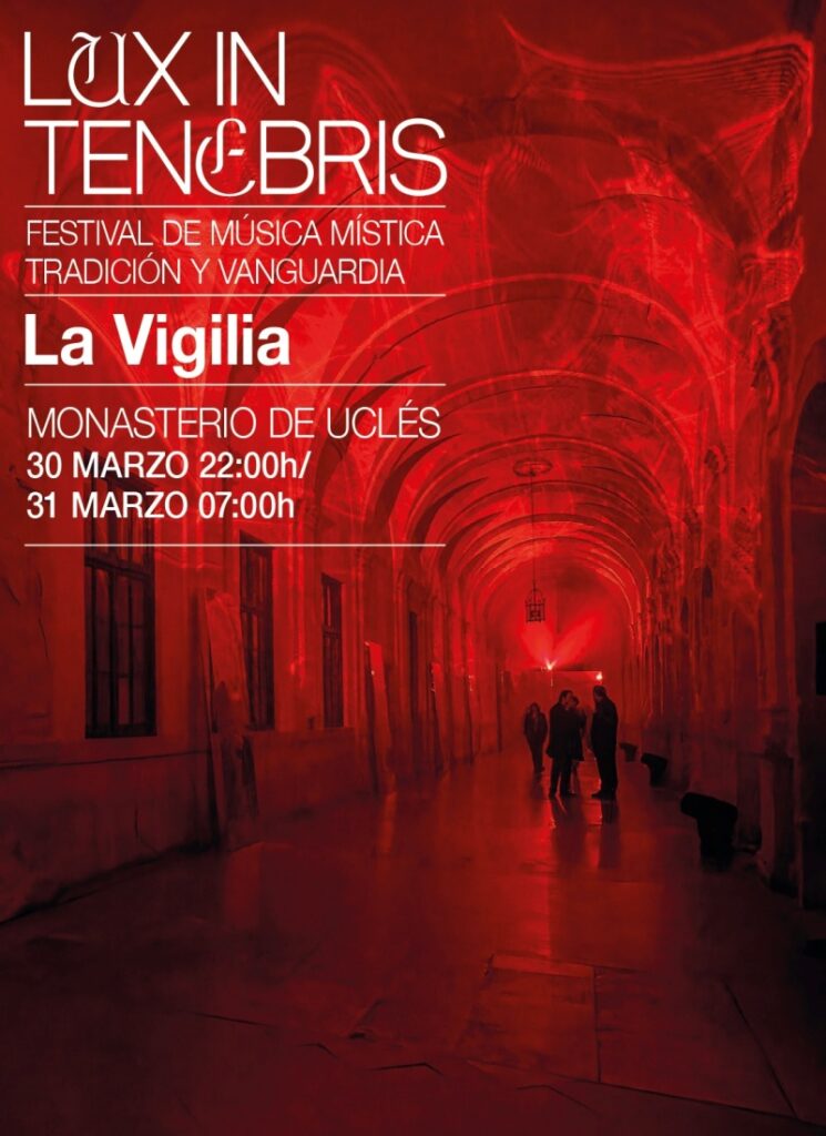 La Vigilia es arte, música y gastronomía, el evento más experimental de Lux in Tenebris. Se trata de una lectura contemporánea de la Vigilia Pascual a través de diferentes miradas artísticas. Transcurre desde las 22:00 del sábado 30 hasta las 06:00 del domingo 31 y ofrece una propuesta radicalmente innovadora. Como cabeza de cartel destacan Raül Refree y la cantante Maria Mazzotta, con canción religiosa, cantares de trabajo o pequeñas tonadas de cuna de la Italia de principios de siglo, transportándonos de la oscuridad al sentimiento de comunidad.