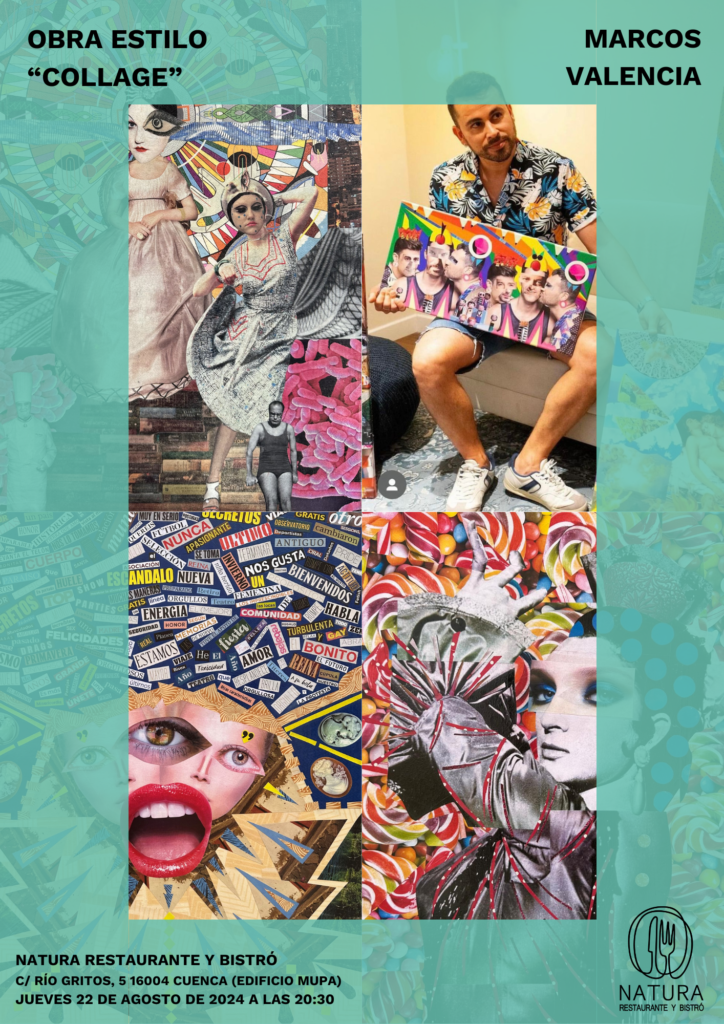 Marcos Valencia, nacido en Cuenca en 1981, ha desarrollado una prolífica carrera artística que lo ha llevado a exponer en diversas ciudades de España y Portugal, como Madrid, Barcelona, Valencia, y Lisboa. Con más de dos décadas de experiencia, ha encontrado en el collage su forma de expresión más auténtica. Su técnica, que consiste en ensamblar recortes de revistas, carteles y otros materiales impresos, le permite crear composiciones que no solo destacan por su colorido, sino también por las historias que cada obra narra.