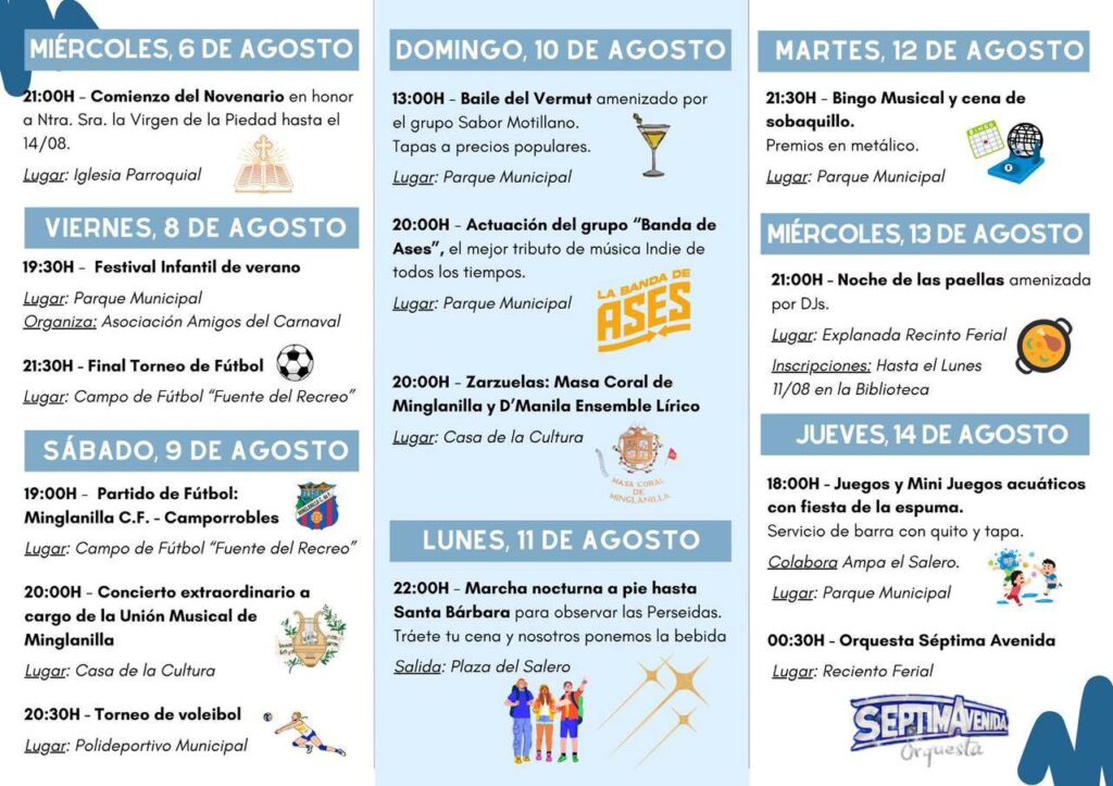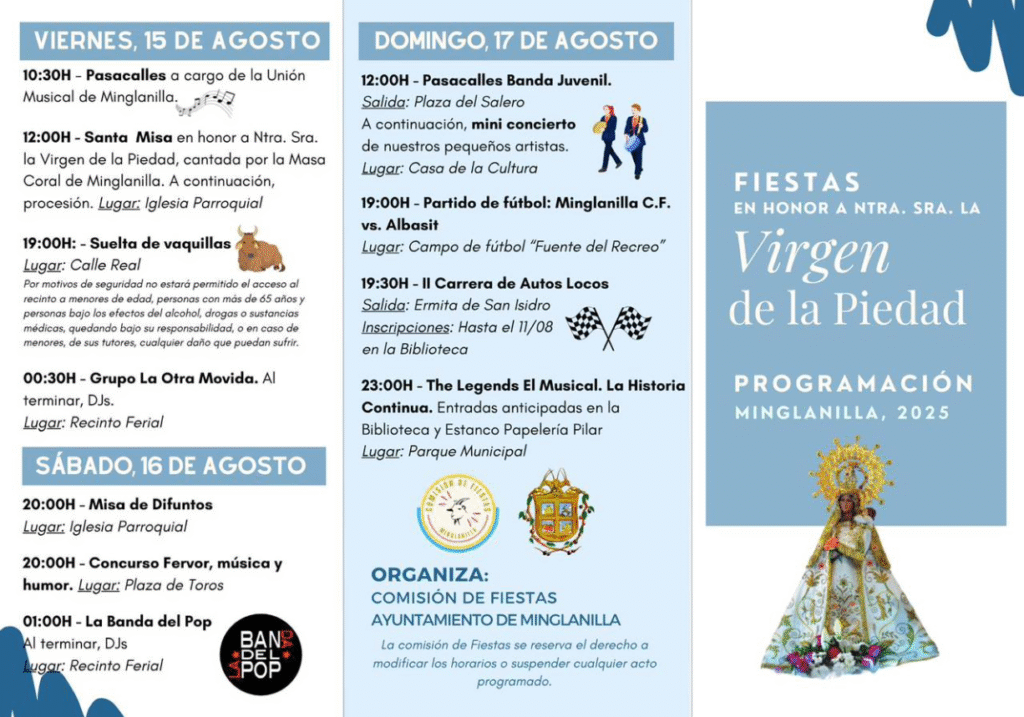 Del 6 al 17 de agosto, el municipio de Minglanilla rinde homenaje a su patrona, Nuestra Señora la Virgen de la Piedad, con una programación repleta de actividades culturales, religiosas y festivas para todas las edades. El espíritu de comunidad y la participación vecinal se unen en una de las celebraciones más esperadas del verano conquense.