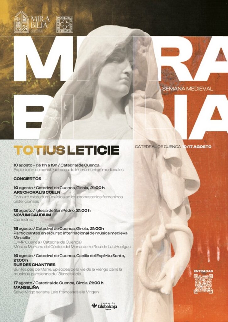 La III Edición de Mirabilia 2024 cuenta con la colaboración de la UIMP Cuenca y el patrocinio de la Fundación Globalcaja. Recordamos que entre los días 9-15 de agosto ha tenido lugar el Curso sobre el Códice de Las Huelgas impartido por un elenco de selectos profesores. Entre los instrumentos ofrecidos han estado: canto (Erwan Picquet), canto e improvisación de organum (Christian Ploix), fídula (Susanne Ansorg), arpa (Manuel Vilas), órgano portativo (Cristina Alís Raurich), percusión (Pere Olivé), cítola, guiterna e instrumentos de plectro (María de Mingo). En las charlas se ha presentado el Ars Antiqua y su contexto musical en el s. XIII (Dr. Rob C. Wegmann), y acerca del contexto e interpretación del Códice Las Huelgas (Dr. David Catalunya).