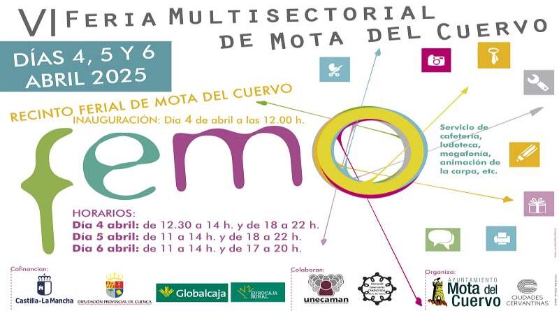 El Ayuntamiento de Mota del Cuervo nos anuncia la celebración de la VI Feria Multisectorial FEMO 2025, que tendrá lugar los días 4, 5 y 6 de abril en el Recinto Ferial de Mota del Cuervo. La inauguración oficial se llevará a cabo el 4 de abril a las 12:00 horas.