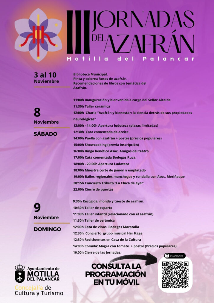 La localidad conquense de Motilla del Palancar se prepara para acoger los días 8 y 9 de noviembre la tercera edición de las Jornadas del Azafrán, una cita que pone en valor la tradición, la cultura y la gastronomía en torno a este preciado “oro rojo” de La Mancha.