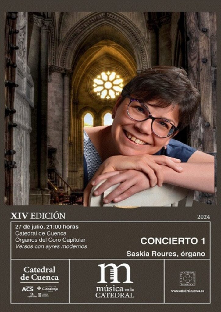 La XIV Edición 2024 de ‘Música en la Catedral’ se inicia hoy, sábado 27 de julio a las 21:00 horas, con la actuación en la Basílica conquense de la magnífica intérprete Saskia Roures Navarro que nos trae un programa titulado »Versos con ayres modernos». Un concierto en el que une la tradición litúrgica de los versos con las nuevas tendencias estéticas que entraron a formar parte del repertorio organístico en el s. XIX, de la mano de compositores como Ledesma, Anglés o Lidón