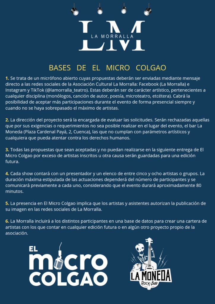 La Asociación Cultural La Morralla presenta un nuevo espacio de expresión cultural en Cuenca: El Micro Colgao, un proyecto para dar voz y escenario a cualquier disciplina artística —monólogos, poesía, música, microteatro, etcétera—.