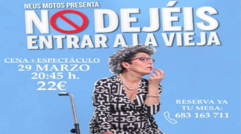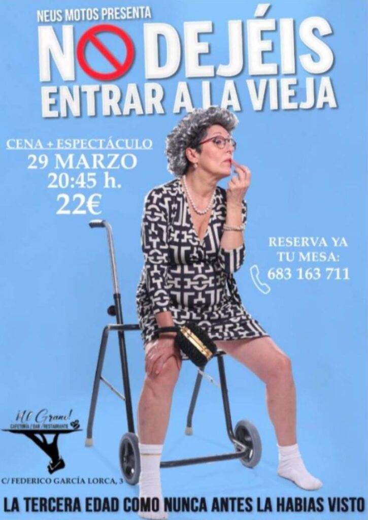 El amor no tiene edad, mientras haya vinagra para empalmar, fisio-cream para el dolor muscular y un desfibrilador para reanimar y si tomas sintrón, cuidadín, porque cualquier emoción puede ser perjudicial. Y eso Neus Motos lo sabe bien y nos lo cuenta en su monologo No dejéis entrar a la vieja donde habla de la tercera edad, esa en la que hay que mantenerse activo, vivo y feliz, para no dejar que ese viejo que todos llevamos dentro nos desanime.