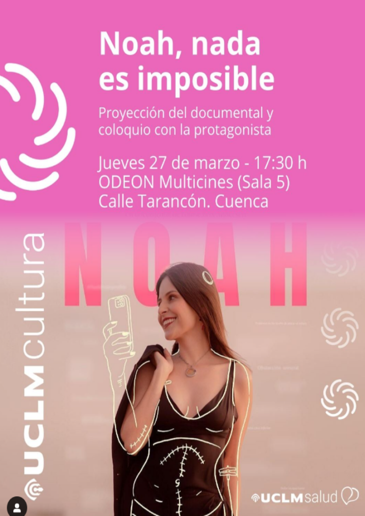 De forma reciente, ha estrenado el documental Noah, en el que la joven valenciana narra las dificultades de su realidad desde una mirada dura, pero también esperanzadora y resiliente. Se proyectará en los Odeón multicines de la calle Tarancón el próximo 27 de marzo a las 17:30 horas. La entrada será gratuita y al finalizar el visionado Noah participará en un coloquio con el público organizado por las áreas de Salud y Cultura de la UCLM.