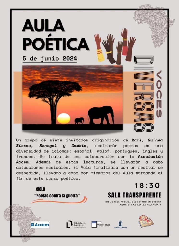 Un grupo de siete invitados originarios de Mali, Guinea Bissau, Senegal y Gambia, recitarán poemas en una diversidad de idiomas: español, wólof, portugués, inglés y francés. Se trata de una colaboración con la Asociación Accem. Ademas de estas lecturas, se llevarán a cabo actuaciones musicales.
