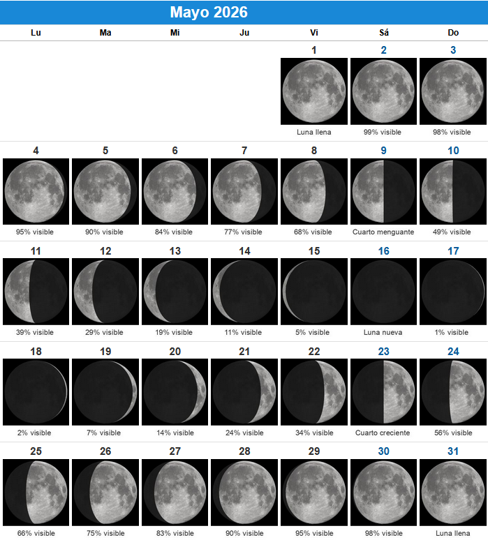 Además, mayo contará con un fenómeno poco frecuente: dos lunas llenas, los días 1 y 31, lo que da lugar a la conocida popularmente como “Luna Azul”, es decir, la segunda luna llena dentro de un mismo mes.