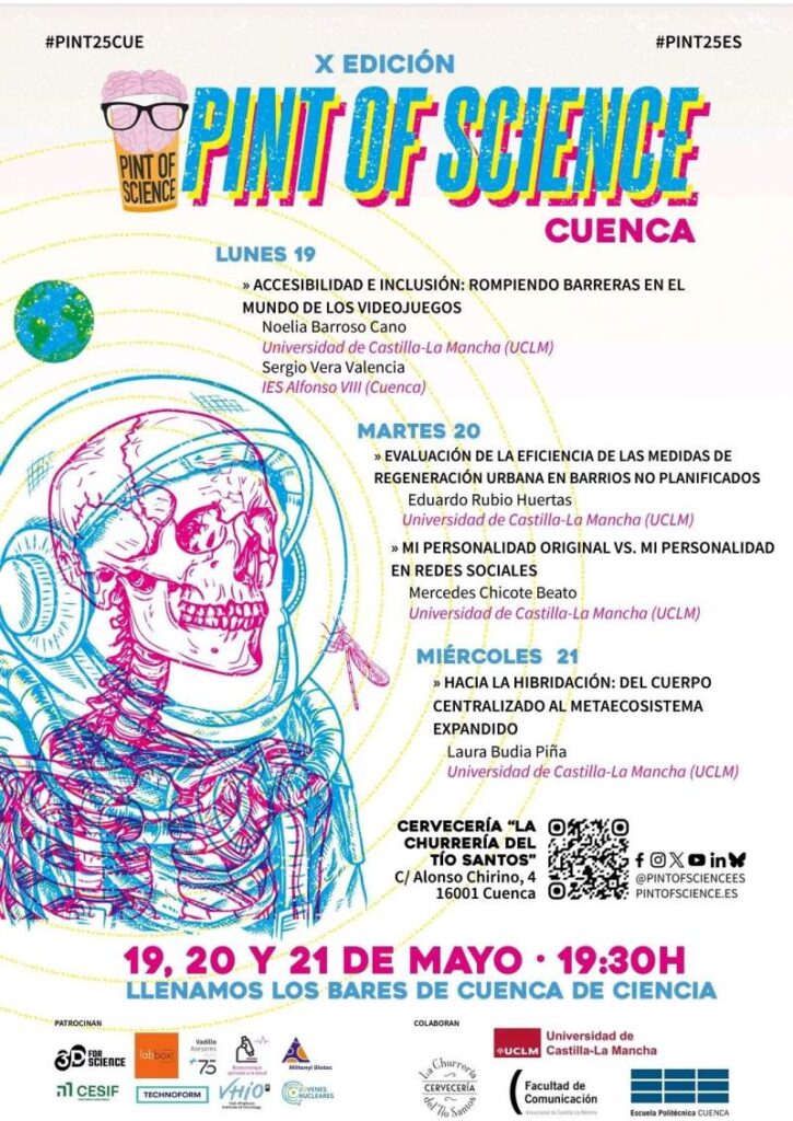 En Cuenca, Pint of Science se celebrará en la cervecería La Churrería del Tío Santos (calle Alonso Chirino, 4) a partir de las 19:30 horas, con un total de cuatro charlas científicas que cubrirán distintas temáticas, desde la accesibilidad e inclusión, planificación urbana, ciberbullying en las redes sociales y la conexión naturaleza-humano-tecnología.