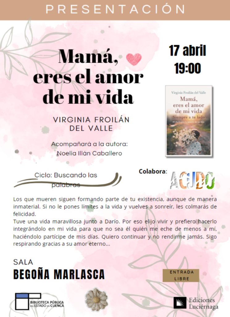 La Sala Begoña Marlasca de la Biblioteca Pública del Estado en Cuenca “Fermín Caballero” acoge, el próximo jueves 17 de abril, la presentación de ‘Mamá, eres el amor de mi vida’ de Virginia Froilán.