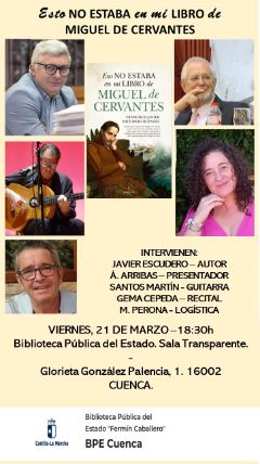 La Sala Transparente de la Biblioteca Pública del Estado en Cuenca ‘Fermín Caballero’ acoge el próximo viernes 21 de marzo a las 18:30 la presentación del libro ‘Eso NO ESTABA en mi LIBRO de MIGUEL de CERVANTES‘, una obra del escritor F. Javier Escudero que desafía la imagen tradicional del autor de Don Quijote.