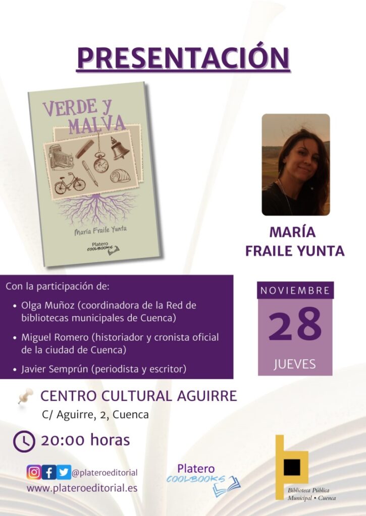 El día 28 de noviembre a las 20:00 horas, jueves, tendrá lugar en la Biblioteca Municipal del Centro Aguirre la presentación del libro Verde y Malva, de María Fraile Yunta.