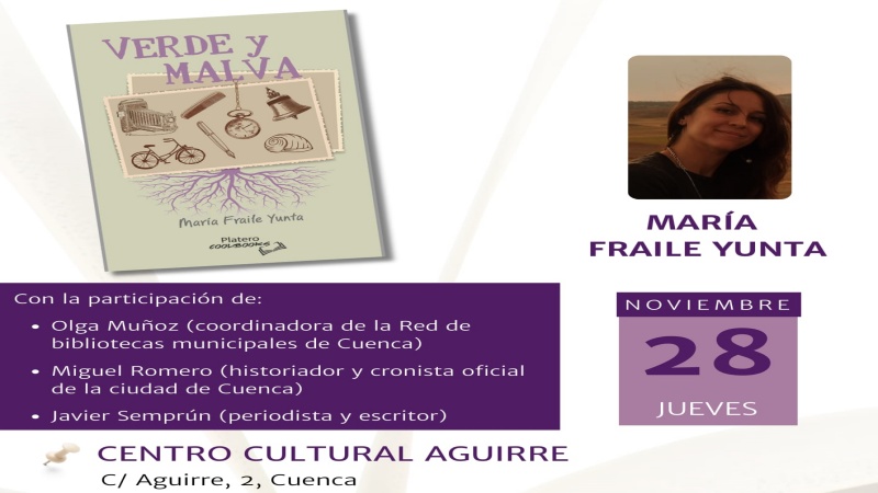El día 28 de noviembre a las 20:00 horas, jueves, tendrá lugar en la Biblioteca Municipal del Centro Aguirre la presentación del libro Verde y Malva, de María Fraile Yunta.