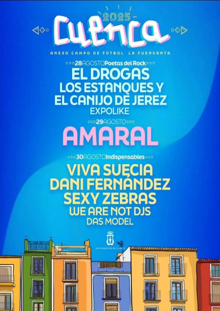 Los conciertos se celebrarán en el estadio municipal de La Fuensanta con las actuaciones de Poetas del Rock el jueves 28 de agosto; Amaral el viernes día 29; y el Festival Indispensables con Viva Suecia, Dani Fernández, Sexy Zebras, We are not DJs y los conquenses Das Model el sábado 30.