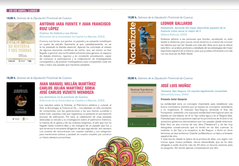 Debido a las condiciones climáticas adversas, las diversas actividades programadas para el lunes 29 de abril en la Feria del Libro ‘Cuenca Lee 2024’ de Cuenca han sido reubicadas.