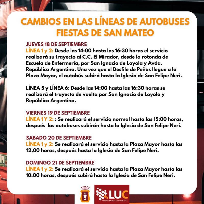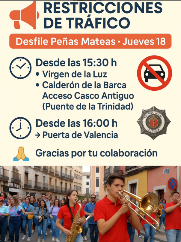 Las fiestas comenzarán el jueves, 18 de septiembre a las 15:30 h. con el Desfile Inaugural de Peñas Mateas, que recorrerá la ciudad desde la Plaza de España hasta la Plaza Mayor. A las 17:00 h., el balcón del Ayuntamiento acogerá el solemne Pregón de San Mateo, pronunciado por Diego Escudero Atienza, con la presentación de Laura García Melero, pregonera de 2024 amenizado por la tradicional selección de pasodobles que interpretará la Banda de Música de Cuenca.