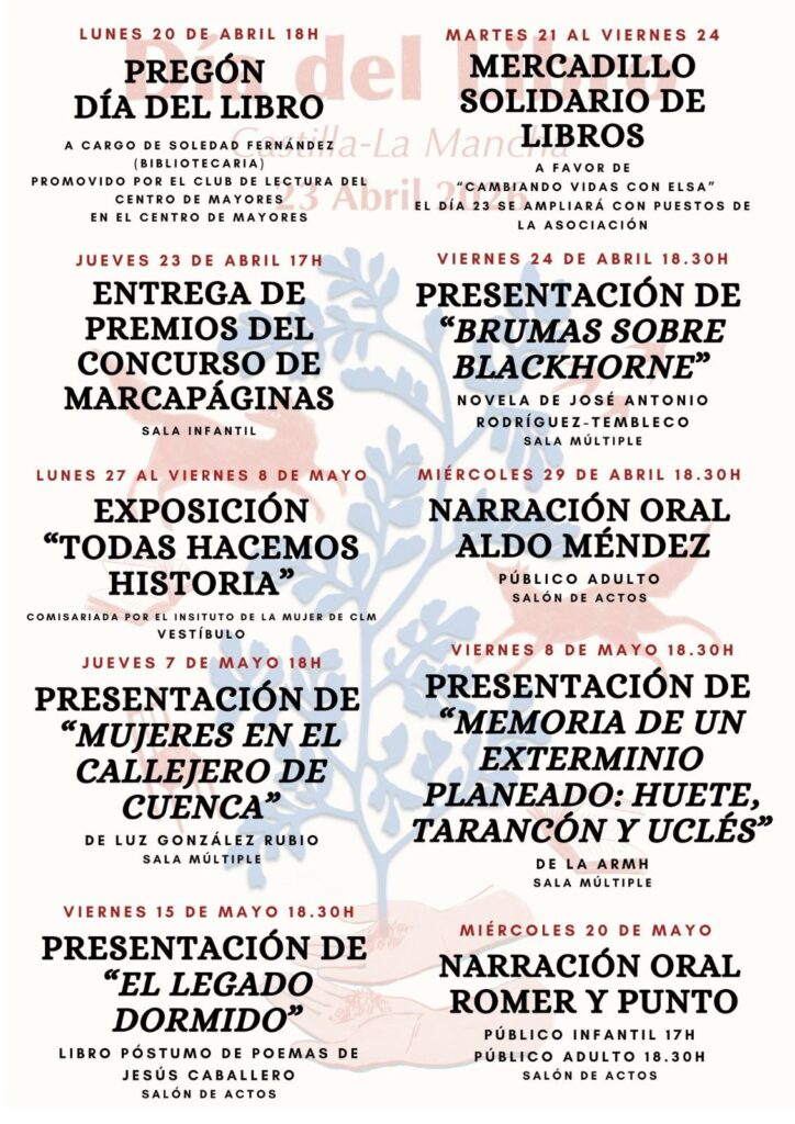 La Biblioteca Municipal Luis Rius de Tarancón ha preparado una completa programación con motivo del Día del Libro 2026, que se desarrollará del 20 de abril al 20 de mayo en la Casa de Cultura.