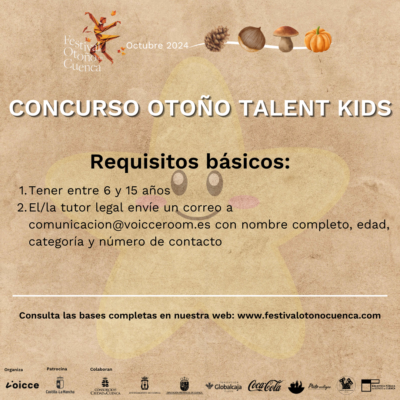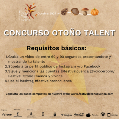 Otoño Talent: dirigido a artistas mayores de 16 años. Para participar, debes subir un vídeo de tu actuación a Instagram o Facebook, mencionar a @festivalcuenca y @voicceroom, y utilizar el hashtag #festivalotonocuenca. ¡No olvides enviar un correo con tus datos a comunicacion@voicceroom.es para completar la inscripción!
