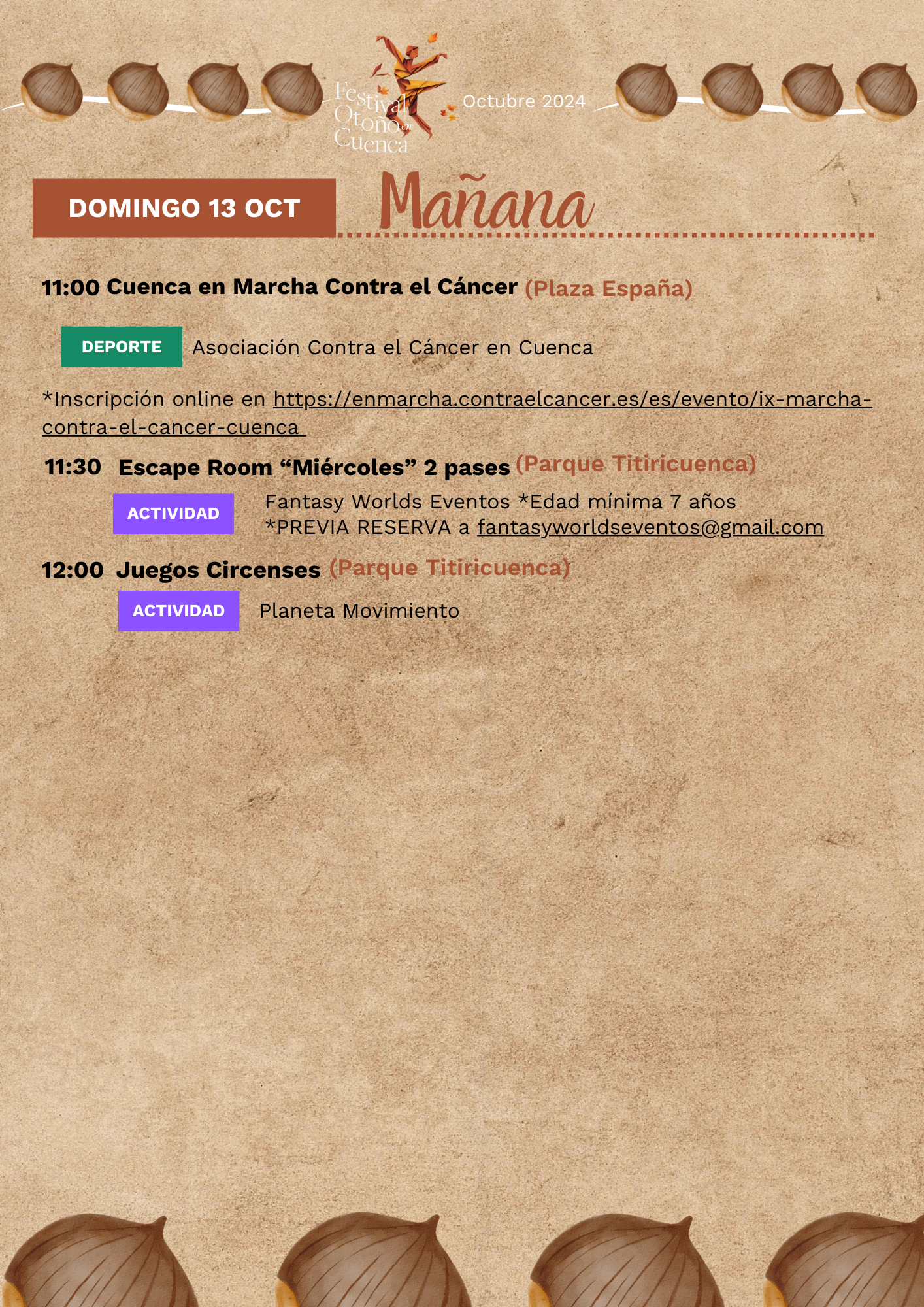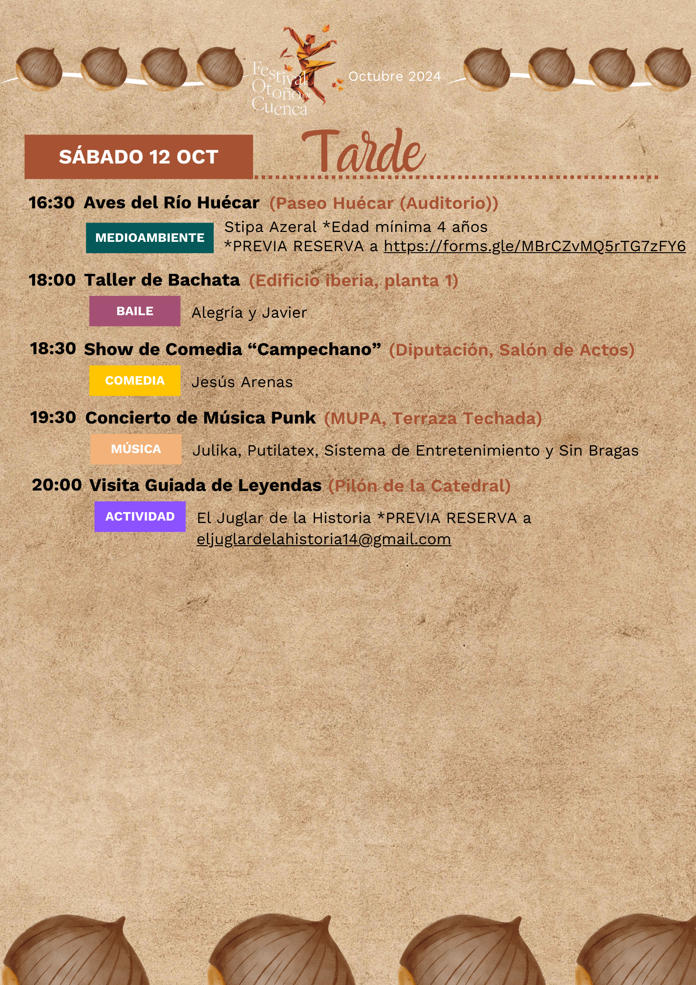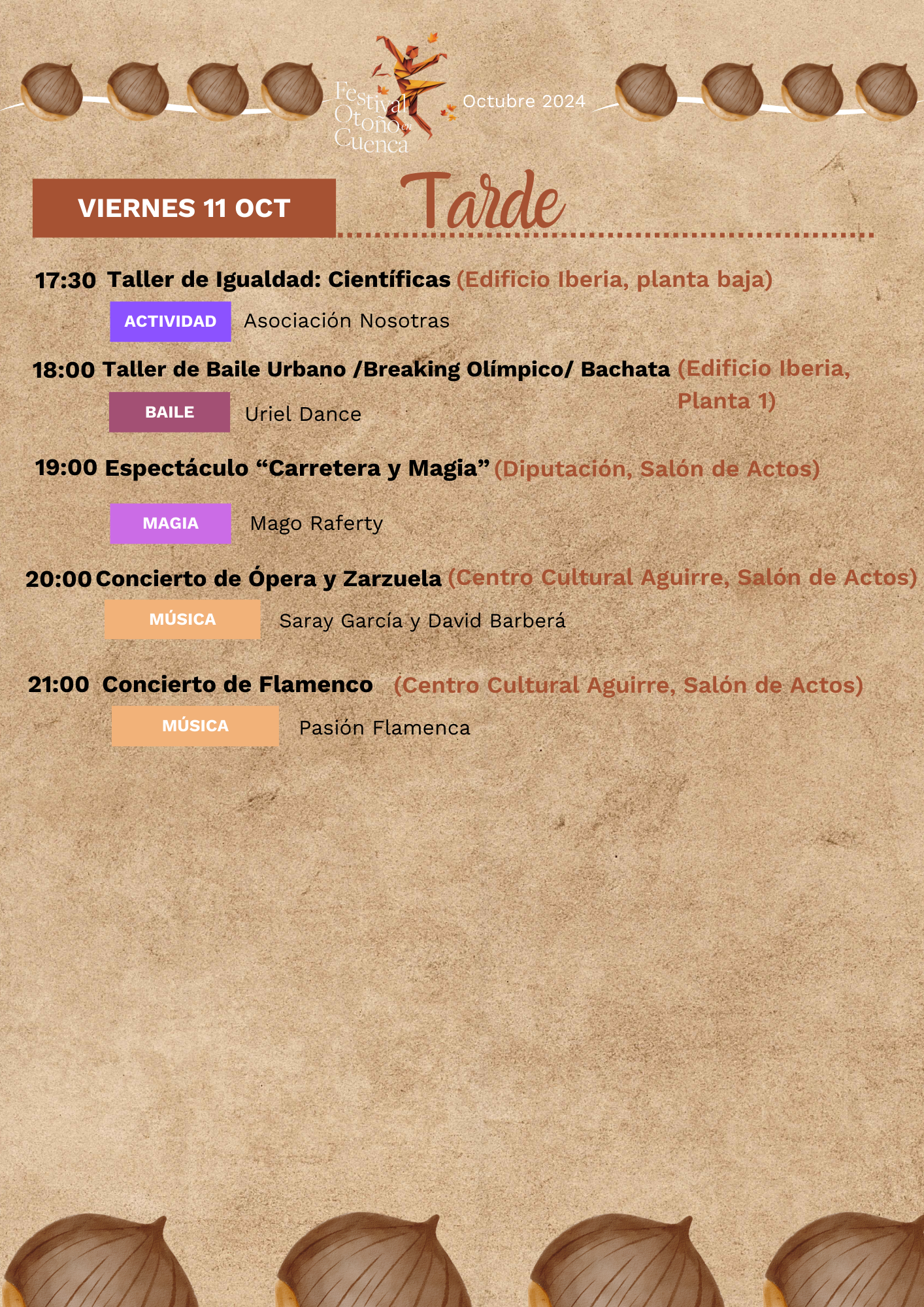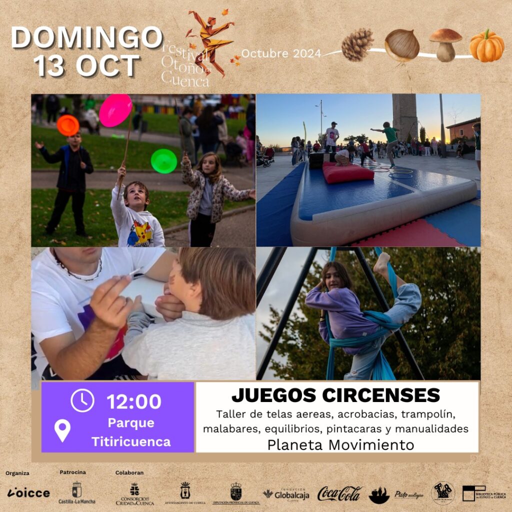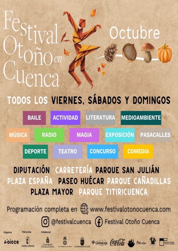 Desde la organización del festival quieren invitar a todos los conquenses a no dejarse vencer por el mal tiempo: “Este año, el Festival de Otoño en Cuenca no se detiene ante la lluvia; hemos reubicado todas las actividades para que puedas seguir disfrutando de la mejor programación cultural. ¡Trae a los más pequeños al Edificio Iberia, el Centro Cultural Lucas Aguirre y el Salón de la Diputación Provincial, donde se realizarán actividades divertidas y educativas para toda la familia!