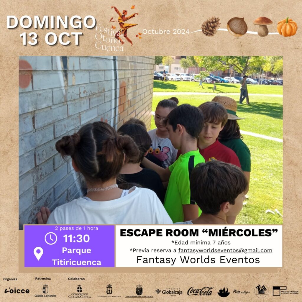 11:30: Escape Room “Miércoles” – presentado por Fantasy Worlds Eventos.