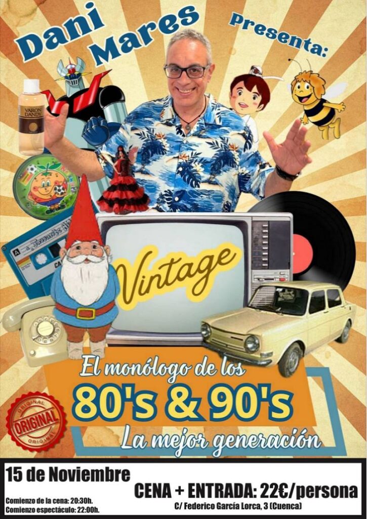 Disfruta del espectáculo Vintage de Dani Mares en Restaurante Al Grano (Cuenca) el 15 de noviembre: cena + monólogo nostálgico de los 80 y 90
