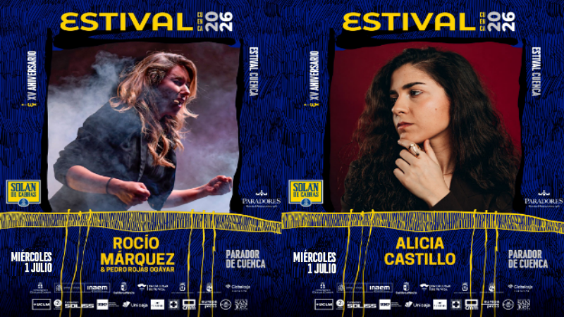 CARTEL DE ESTIVAL CUENCA. El concierto de Rocío Márquez y Alicia Castillo (Estival Flamenco Experimental/Estival Canción de autor) se suma a los ya anunciados de Carlos Núñez (Galicia), Premio Manuel Margeliza 2026 (Estival Folk, lunes 29 de junio), María Terremoto y Pasión Flamenca (Estival Flamenco, martes 30 de junio) y Paquito D’Rivera y The Teacher’s Band (Estival Jazz, jueves 2 de julio). Todos ellos se celebrarán en el Escenario Solán de Cabras del Parador de Cuenca.