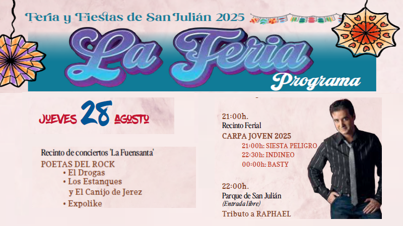 La jornada se cerrará con el gran espectáculo musical de las fiestas en el Parque de San Julián a las 22:00 horas, con entrada libre: y un tributo a Raphael, que repasará los grandes éxitos del artista jienense en una velada de emociones y nostalgia.