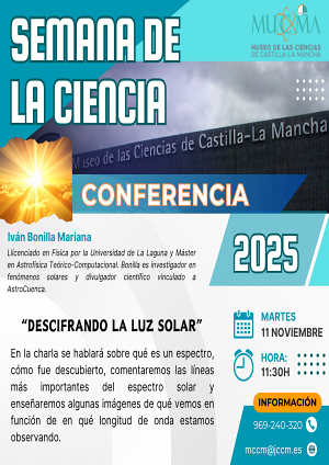 Impartida por Iván Bonilla Mariana, licenciado en Física por la Universidad de La Laguna y Máster en Astrofísica Teórico-Computacional. Bonilla es investigador en fenómenos solares y divulgador científico vinculado a AstroCuenca.