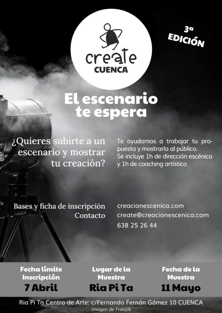 También sigue abierto el plazo para participar en la tercera edición de “Create Cuenca” convocado por Creación Escénica, en Ría pi ta centro de arte, con el fin de dar la oportunidad a tod@ ciudadan@ de poder trabajar y mostrar su propuesta escénica frente a un público. En la presente edición tienen cabida todas las disciplinas artísticas, cualquier acto escénico que sea factible de subirse a un escenario, ya sea danza, música, teatro, monólogos, canto, mimo, humor, … cualquier obra artística que quiera ser mostrada.