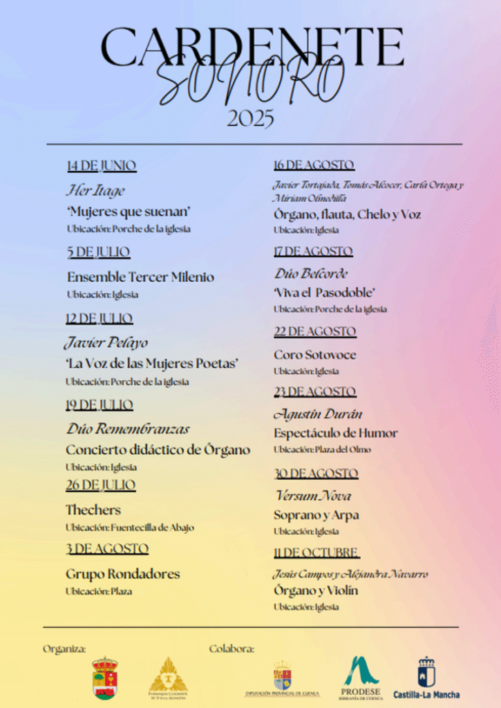 Cardenete Sonoro 2025 continúa así consolidándose como uno de los referentes culturales del verano conquense, al conjugar tradición y contemporaneidad en un entorno patrimonial singular.
