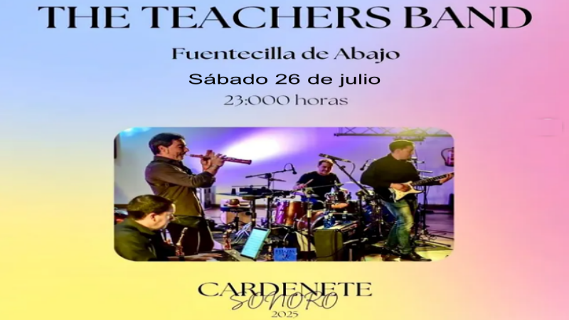 El próximo sábado 26 de julio, a las 23:00 h., la emblemática formación conquense The Teachers Band ofrecerá un concierto en la Fuentecilla de Abajo de Cardenete, en el marco del ciclo Cardenete Sonoro 2025, una ambiciosa propuesta cultural impulsada por el Ayuntamiento y la Parroquia de Cardenete, que ofrece una docena de espectáculos entre junio y octubre.