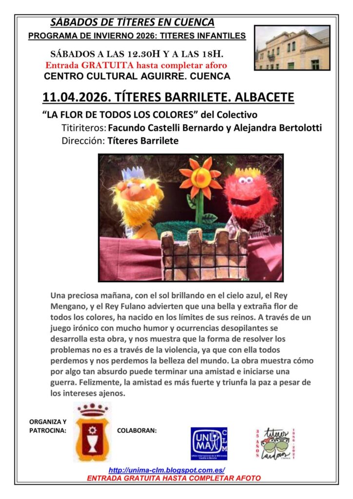 El ciclo Sábados de Títeres en Cuenca pone el broche final a su Programa de Invierno 2026 con una propuesta que combina humor, imaginación y valores universales. El próximo 11 de abril, el Centro Cultural Aguirre acogerá el espectáculo “La flor de todos los colores”, a cargo del grupo Títeres Barrilete, procedente de Albacete.