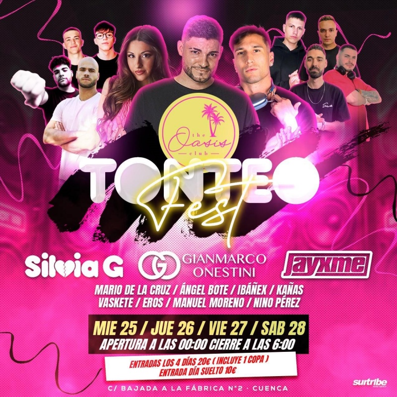 Cuenca se prepara para recibir el TONTEO FEST, un festival de música electrónica que promete revolucionar las noches de la ciudad. Del 25 al 28 de septiembre, el nuevo espacio de ocio OASIS, ubicado en la c/Bajada a la Fábrica 2, dentro de La Isla de La Ceca, será el epicentro de cuatro noches inolvidables con una cartelera de DJs de primer nivel.