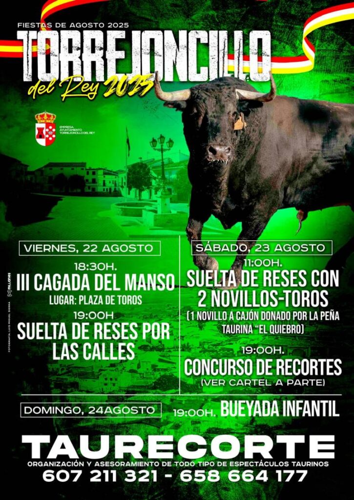 Torrejoncillo del Rey celebra sus Fiestas 2025 con música, sueltas de reses y Concurso Nacional de Recortes. Del 21 al 24 de agosto, pura tradición y fiesta.