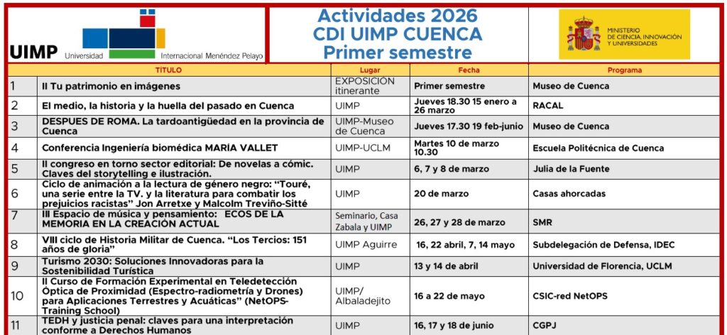 La Universidad Internacional Menéndez Pelayo (UIMP) en Cuenca ha dado a conocer su programación de actividades para el primer semestre de 2026, una propuesta amplia y transversal que se desarrollará entre los meses de enero y junio y que incluye exposiciones, seminarios, congresos, ciclos históricos y cursos especializados. La agenda combina divulgación cultural, reflexión académica y formación avanzada, y se desplegará en distintos espacios de la ciudad.