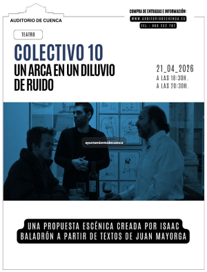 El Teatro Auditorio de Cuenca José Luis Perales acoge el próximo 21 de abril un nuevo éxito escénico con “Un arca en un diluvio de ruido”, la propuesta del grupo Colectivo 10 que ha agotado todas las localidades en sus dos funciones a las 18:30 y a las 20:00. La obra ofrece una experiencia innovadora, más íntima y cercana al público, marcando un giro en la trayectoria del grupo.