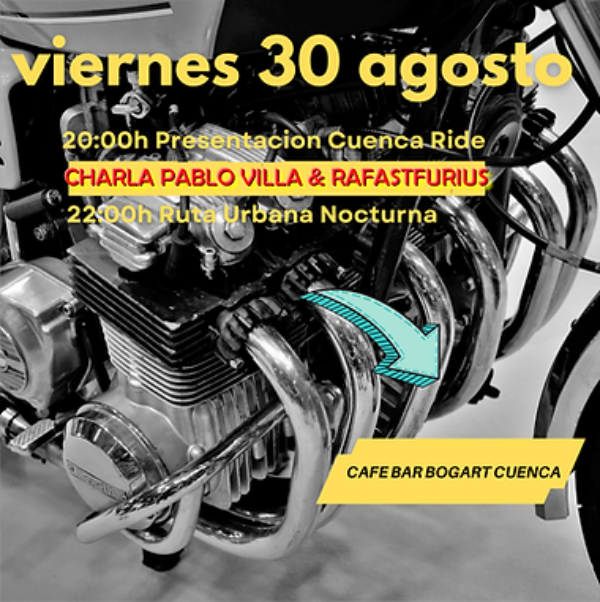 - 20:00h: Las jornadas comenzarán en el Café Bar Bogart con un coloquio motero que promete ser un espacio de encuentro y conversación entre los amantes de las motos y la cultura retro. Contaremos con la participación de figuras destacadas como Pablo Villa y Rafastfurius.