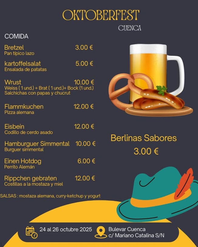 Con la llegada del otoño, Cuenca se prepara para acoger la V edición de la Paulaner Oktoberfest, la célebre fiesta alemana de la cerveza, que tendrá lugar en el Salón Bulevar de Cuenca (C/ Mariano Catalina s/n) desde el viernes 24 hasta el domingo 26 de octubre de 2025. Un evento multitudinario en el que se darán cita todos los amantes de la cerveza, la gastronomía bávara y las tradiciones alemanas.