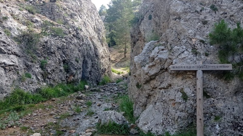 En los últimos centenares de metros de nuestro paseo, el Júcar juega al escondite; las aguas aparecen y desaparecen del regato fijando su nacimiento “oficial” (aunque el agua emerja en una pradera más arriba) en el brote de la oquedad del muro rocoso del sugerente “Estrecho del Infierno”, un paraje inquietante junto con su otro “Ventano del Diablo”.