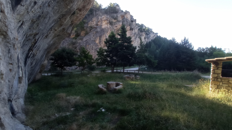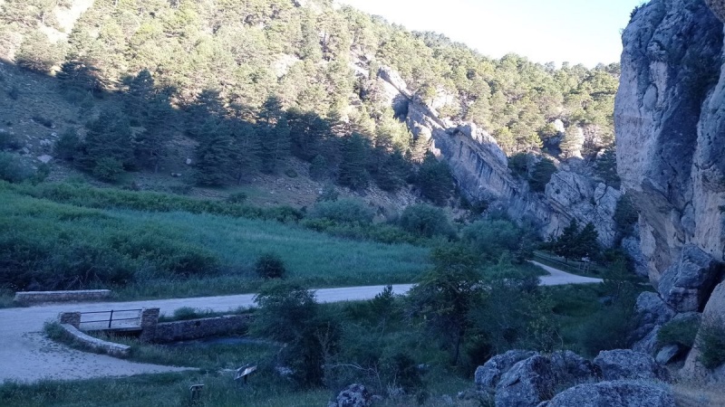 A sus pies, un púber Júcar serpentea tímidamente entre un verde y fresco tapiz de musgo, hierbas y arbustos para recibir, agradecido, las aguas frías y sanas de la coqueta fuente con pilón y escultura roqueña; incorporación que aprovecha para introducirse bajo un último puente (o primero, según se mire) y ocultarse entre un frondoso arbolado.