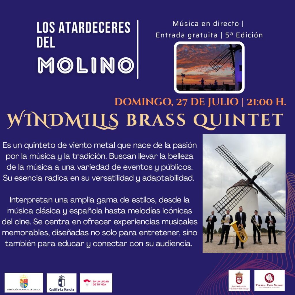 Domingo 27 de julio: clausura a cargo del prestigioso Windmills Brass Quintet, que interpretará una amplia gama de estilos, desde la música clásica y española hasta melodías icónicas del cine.