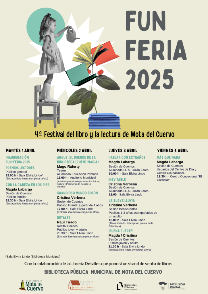 Mota del Cuervo se prepara para celebrar la cuarta edición de Fun-Feria 2025, el Festival del Libro y la Lectura, que se llevará a cabo del 1 al 4 de abril en la Biblioteca Pública Municipal de Mota del Cuervo. Un evento que promete sumergir a la localidad en una experiencia cultural única, con una programación variada que incluye narración oral, teatro, poesía y magia.