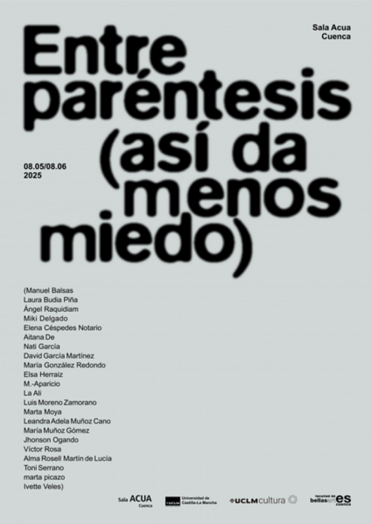 La Sala ACUA de Cuenca se convierte, del 8 de mayo al 8 de junio de 2025, en un espacio para la reflexión y el diálogo artístico con la inauguración de la exposición “Entre paréntesis (así da menos miedo)”, organizada por el Centro de Iniciativas Culturales (UCLM) y protagonizada por el alumnado del Máster en Investigación Artística y Visual de la Facultad de Bellas Artes de Cuenca.